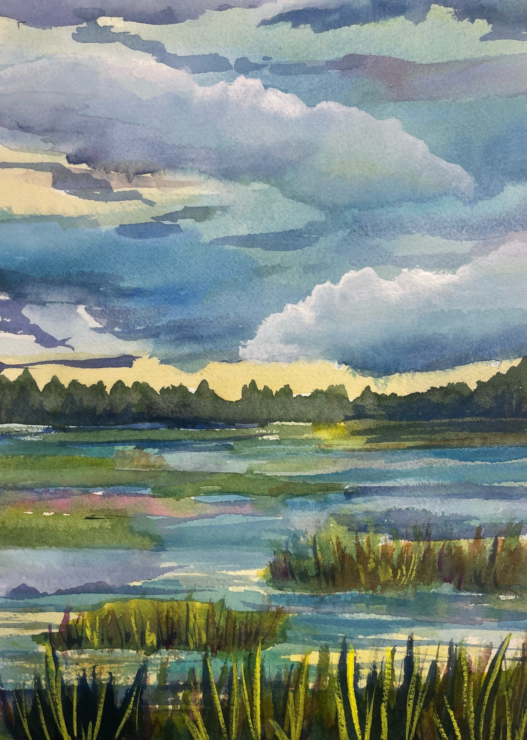One of a kind original vertical 12 X 16 watercolor with arctic white mat. Artwork size 9 X 12