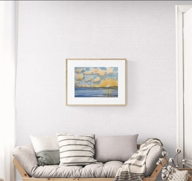 One of a kind original horizontal 16 X 20 watercolor with arctic white mat (no frame). Artwork size 11 X 15